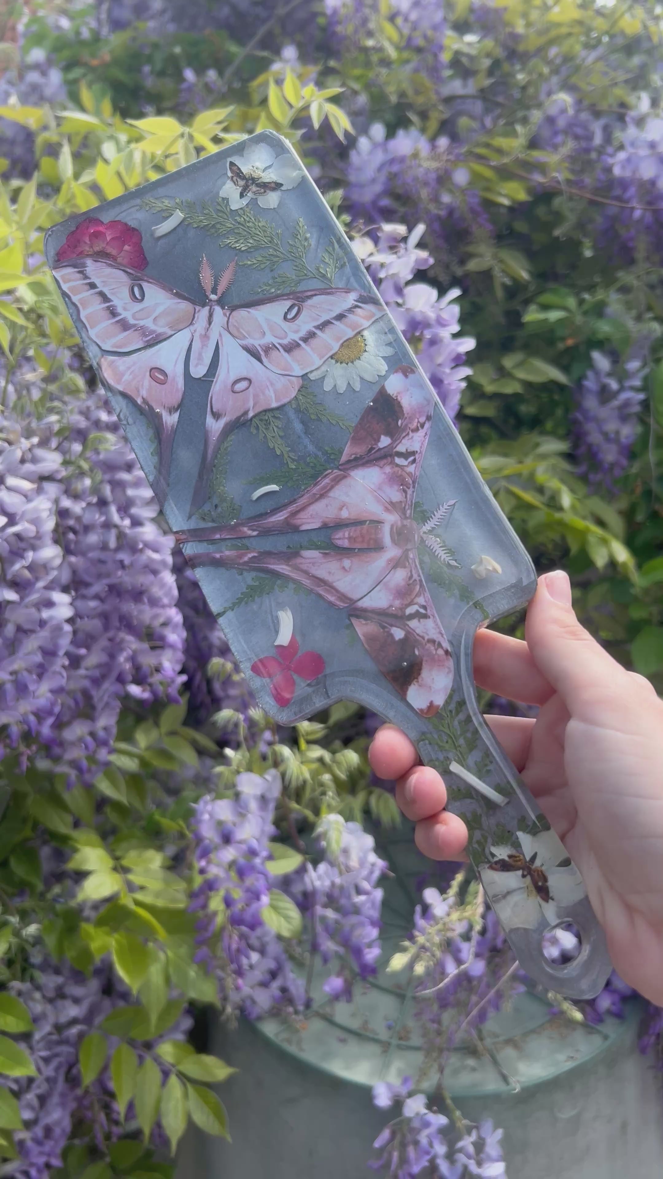 This beautiful full sized paddle has two sides. One with a sexy stripper Baphomet design and the other with beautiful paper moth specimens resting on a bed of real pressed flowers, surrounded by real bones!