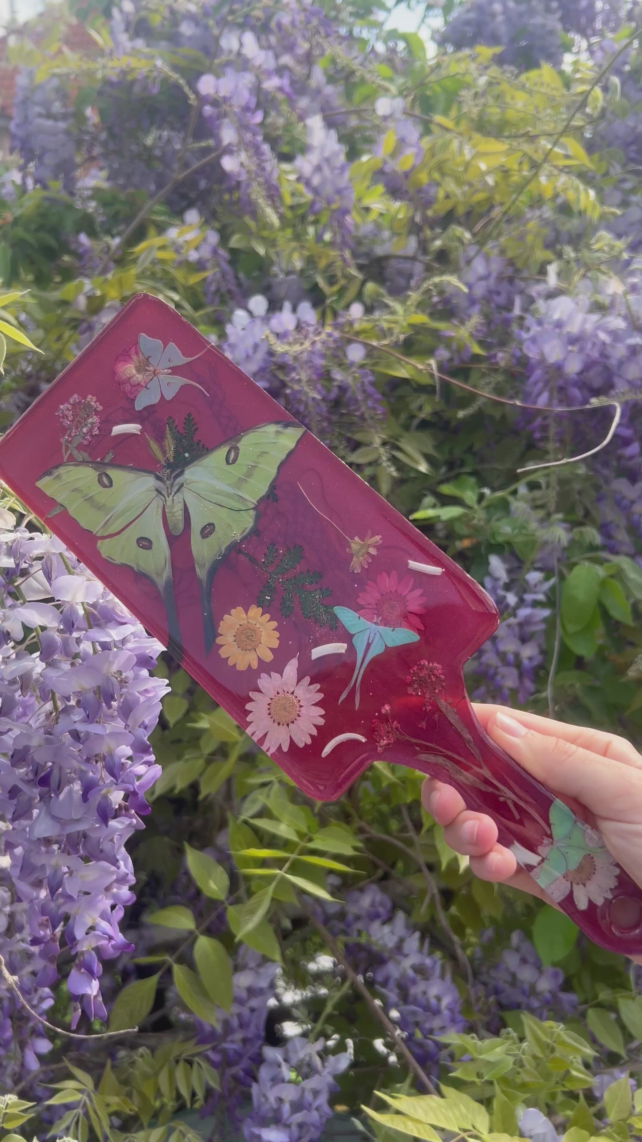 This paddle is super sick, with its double sided design it boasts a killer sexy grim reaper design on one side, and on the other side it has some beautiful paper Luna moth specimens resting on a bed of real pressed flowers, surrounded by real bones!